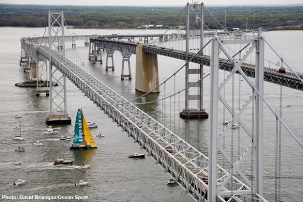 ABN AMRO One, the Dutch yacht affectionately known as ‘Black Betty’, under the Annapolis Bridge and across the finish line south east of Sandy Point, 18 nautical miles from Baltimore’s Inner Harbor, to add another leg win to their tally of three wins and a second place in the Volvo Ocean Race so far.