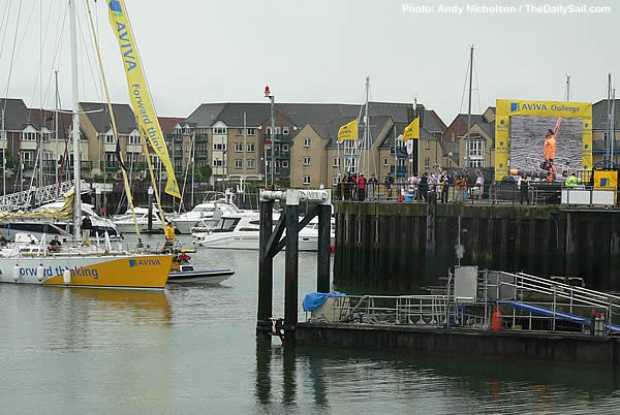 A couple of ‘senior’ ladies had taken up prime position on the dock opposite to where Aviva was to dock. One a friend from Caffari’s father’s yacht club who had followed her every day on the internet. The other clutches Chay Blyth’s book Impossible Voyage.