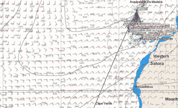 The group passing through the Canaries are playing a dangerous game as although typically there are acceleration zones in the wind as they pass between the islands there is also the possibility of falling into holes to the lee of the islands - these can occur to around 100 miles southwest of the Canaries. Hopefully the wind strength is high enough to minimise this. Generally the great circle cuts through the middle of the next island group - the Cape Verdes off West Africa - and the forecast shows this as being pretty much dead downwind.