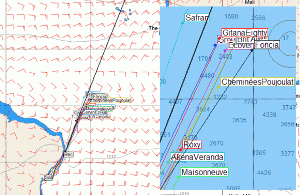 While the leaders are tightly grouped with less than three miles separating the top five in terms of distance to finish (DTF) the ever canny Michel Desjoyeaux on Foncia is some 20 miles to the east of race leader, Yann Elies' Generali, while Marc Guillemot on Safran is taking the option furthest west of the frontrunners, some 60 miles from Generali. With the Doldrums area starting at around 4°N, around 180 miles away still, the leaders can expect to be into the thick of the action overnight tonight. The question is - who will get the best passage through this area, where only a few miles of separation in terms of longitude can define this nautical game of snakes and ladders? At present most of the leaders appear to be aiming at a crossing at around 029°W (see the satellite wind chart below). Yann Elies on Generali took over the lead of the Transat Ecover BtoB at the 1200 sched on Saturday and has held on to it continually ever since, with the except of Foncia leading at the 1400 sched yesterday. This is good news for Elies, after fairly lacklustre performances in his races to date, narrowly beating the two generation old Roxy on the recent TJV. "Michel is overtaking me! He’s going a fraction quicker, but he is under genoa while I’m still under staysail: I'm going to have to manoeuvre... and step up the pace a level," Eliès said yesterday afternoon. "Here we have glorious sunshine but conditions are strange for the upcoming doldrums: there is a windless zone emerging upwind of us. I’m going to follow the ‘professor’ in any case, probably to around 27° West. He’s going fast and he’s giving it his all..." Desjoyeaux, the TJV Open 60 winner, however seemed to have everything under control: "I’ve taken off my foulies and there’s not much more I can do today. Just a bit of tidying up: sponging the bilges and doing a Sunday spring clean… I made the most of Generali being under a cloud to overtake him. We're living heeled over, it's hot and wet and we're getting used to the noise... The doldrums? I'll adjust my course at the last minute!" A feature of the Transat Ecover BtoB that makes it different from the TJV is that it is much more upwind - first in the ENEerly getting out of Salvador and up to Recife, then once again once the boats break into the northeasterly trades of North Atlantic. This may be one of the reasons Generali has come to the fore. From on board Gitana Eighty Loïck Peyron commented: "It’s a bit tedious at the moment and still as hot as ever. We’ve already covered 900 miles in the past three days: it’s not bad! In my opinion, the lead group will remain bunched together to pass the doldrums… But it looks far from simple...: there are some little circles on the grib files, which means that there’s no wind…" On Safran Marc Guillemot agrees: "It’s like an oven down below... And I caught a flying fish in my ballast tank: I’ve got it out but it’s not in good condition! We should pass the equator tonight (Brazilian time) and I’m beginning to shift to the West a little more than my friends: I've decided to separate myself from the fleet who don't want me any more and I reckon that the best option is the American one as opposed to the African one. We'll see. The boat's going well and is proving to be very successful..." Mike Golding remains up with the leaders despite some more technical problems with his new Ecover. "I’ve had ballast problems and the leak has spread across the boat flooding the engine and the batteries," commented Golding. "However, I have managed to contain the leak and resolve the electrical issues now. My new boat, which had only done four days at sea before the TJV goes really well downwind and reaching and it's okay upwind too. I'm not much looking forward to the Doldrums it has to be said!" Golding summed up his afternoon yesterday as 'hot and bothered'. "It is very hot and very salty. I have decided to take a fresh water shower and damn the fuel. It is pretty uncomfortable. The breeze is south of east, round at 160 degrees, we are just genoa reaching and trying to line up for the Doldrums." Of this third place (at the time), and his positioning within the group he comments: "I think I'm looking not too bad. Everyone is around and we keep changing places, kind of just depending where you are in the cycle. During the night I was behind Gitana at one point. I just decided to try a reef then, and of course then the breeze dropped. " BritAir has always been out there to the left/west. The routeing is kind of taking us slightly right of the rhumb line, and it is now a case of just trying to get the best route through the Doldrums. Safran's going towards the shortest route through and I really do think that at the moment that everyone is just sticking together because it is so messy and no one want to get separated at this stage. It is generally very difficult, just a mess. "Otherwise all is well with the boat. It is quite quiet. I had a big rain shower this morning and we were blasting off at 24 knots for about half an hour under full main and genoa, which was interesting, but everything seems to have settled down and I am getting my head round not overloading the ballast system, I am being quite gentle with it and the scoops are working fine on both sides. They have done a nice job on the them." On Cheminées Poujoulat, Bernard Stamm has also not has his eye entirely on the ball: "I have computer problems: my main computer has crashed and since Saturday lunchtime I haven’t been able to get any grib files. I’m making do with my secondary computer. Right now, the wind is on the beam at fifteen knots but I had a squall this morning and the seas are still a bit messy." The next 48 hours will be critical times in the Transat Ecover BtoB. |