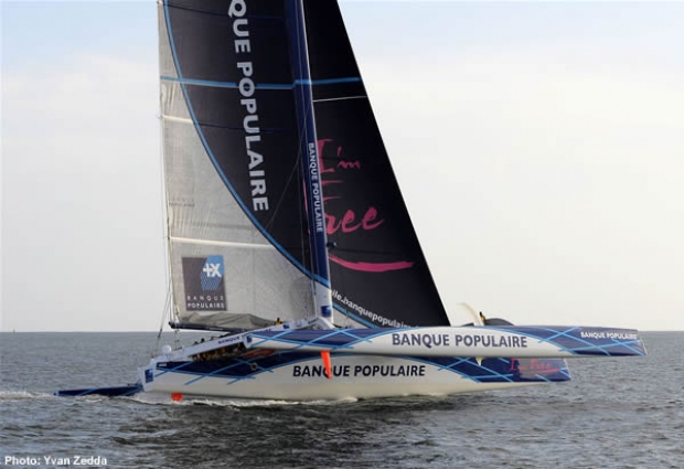 On paper the new Banque Populaire Maxi is the world’s largest racing trimaran at 40m LOA, so big in fact that she could fit an ORMA 60 on to her foredeck (if she had one). Given that with maxis, both mono and multi, the longer and more powerful you get, so the breakage and nightmares increase exponentially, it appeared when we first heard about this new beast that skipper Pascal Bidegorry had turned megalomaniac and her crew would be spending as much time fixing the boat as sailing her.