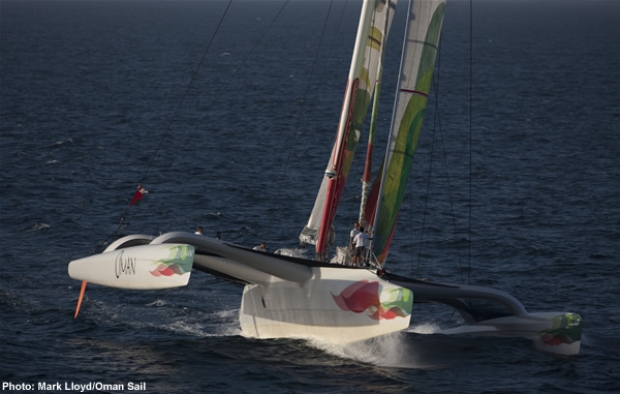 Oman Sail's new Arabian 100 (A100) trimaran during sea-trials off the Omani coast. Now named Majan, after the ancient name for Oman, Oman Sail's new flagship is now operational and is heading into the Gulf and a tour of neighbouring countries.