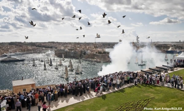 Peter Dimech, Principal Race Officer for the Royal Malta Yacht Club, had divided the yachts into five starts, with the smallest boats leaving at 11 o'clock sharp to the resounding crash of a 24-pounder cannon, manned by Fondazzjoni Wirt Artna volunteers dressed in 19th century Royal Malta Artillery uniform. Contending with light and variable winds in the start area, Tomas Dolezal's Three Sisters (CZE), with Milan Hajek on the helm, took the bragging prize for first yacht out through the breakwater. She was closely followed by the Maltese local heroes on Geisha. David Pizzuto is on his eighth race. Both he and his crew will have been delighted to overhaul their Czech opponents by St George's Bay and to round the final mark off the Maltese coast in first place. The Italians on Alba Blu were third, rounding just before midday.