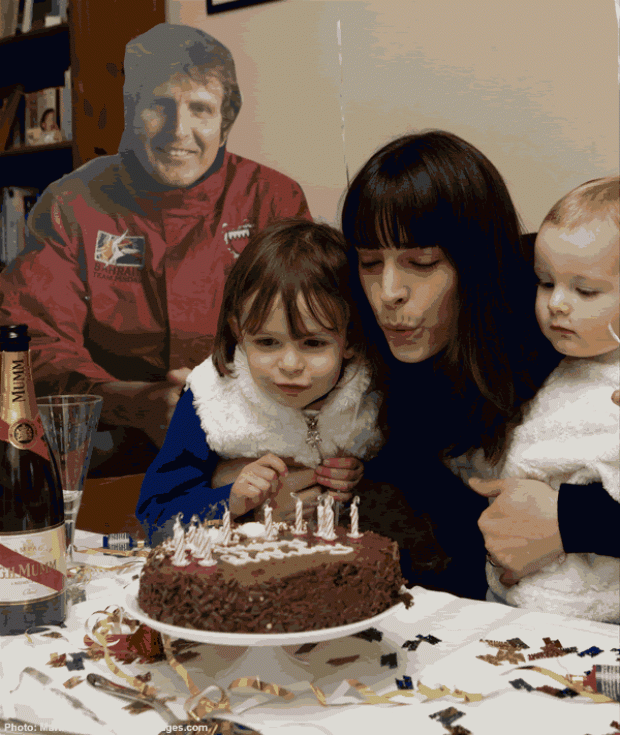 The celebrations were far from flat when an elated Nathalie and their two young children Genevieve (3) and Tristan (18 months), later enjoyed a traditional birthday tea party, speaking to the ‘real’ Brian at sea on board his boat Bahrain Team Pindar, while his cardboard stand-in looked on.