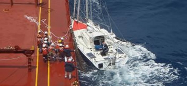 The 948ft CSK Radiance made two passes, manoeuvring the huge ship alongside Budel’s 40ft yacht before the Dutch sailor was transferred aboard. “The conditions for rescue were not ideal,” said Race Director Josh Hall who, along with MRCC Reunion and the captain of the ship, coordinated the rescue. “There was a seven metre swell running and a moderate wind of around 20 knots, making it difficult to manoeuvre a ship the size of Radiance alongside a small yacht. Clearly Captain Singson and his crew are highly experienced seamen and we thank them profusely for not only diverting to help Nico, but also for their skill and determination in pulling off a successful operation.”
