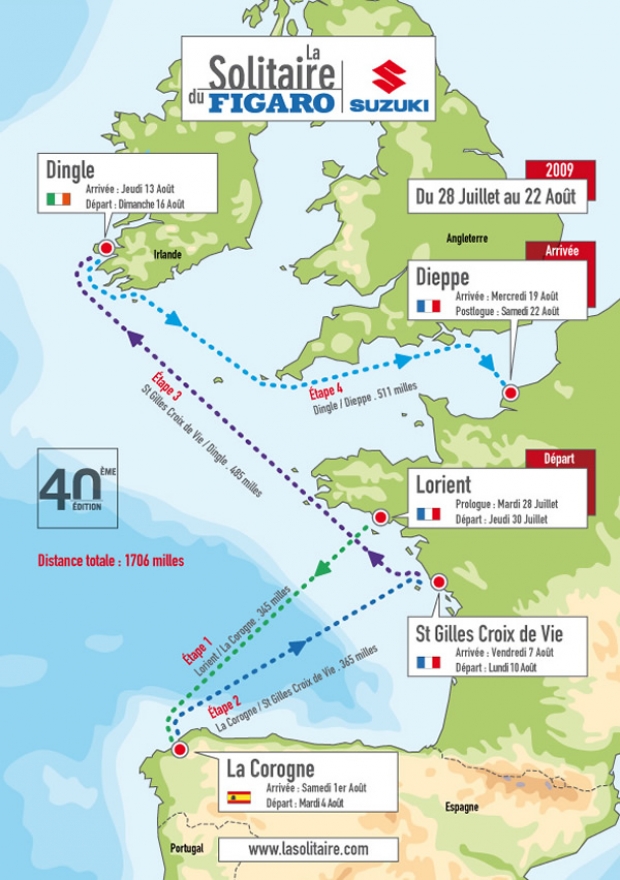 In 2009 La Solitaire du Figaro celebrates its 40th anniversary and a remarkable history. Since 1970, 538 sailors have taken part in the unofficial world championship of singlehanded offshore racing and there will be more newcomers in 2009. In this landmark year, the race sticks to the traditional format with a 1,706 nautical mile course set between France, Spain and Ireland on the Atlantic Ocean, the Irish Sea and the English Channel.