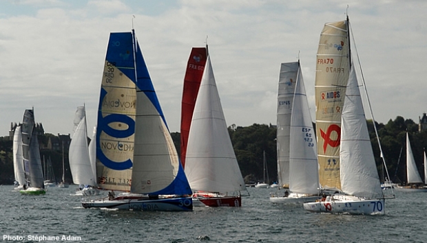 The second edition of the Class 40s 1000 Milles Brittany Ferries began this morning off Saint-Malo. At 1100 the fleet of 17 boats set sail doublehanded on the course that will take them first to Plymouth, then Santander before finishing in Roscoff. It was Bruno Jourdren and Groupe Bel Open 60 skipper Kito de Pavant on th Rogers designed