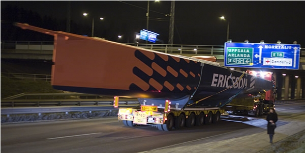 The boat left Kista by truck late on the evening of 13 December, bound for Frihamnen in Stockholm, and then loaded onto a cargo ship headed towards Lanzarote, where she is expected to arrive late December. The transportation of the 21.5m long by 6m wide hull, weighing some six tons, through central Stockholm required a lot of planning.