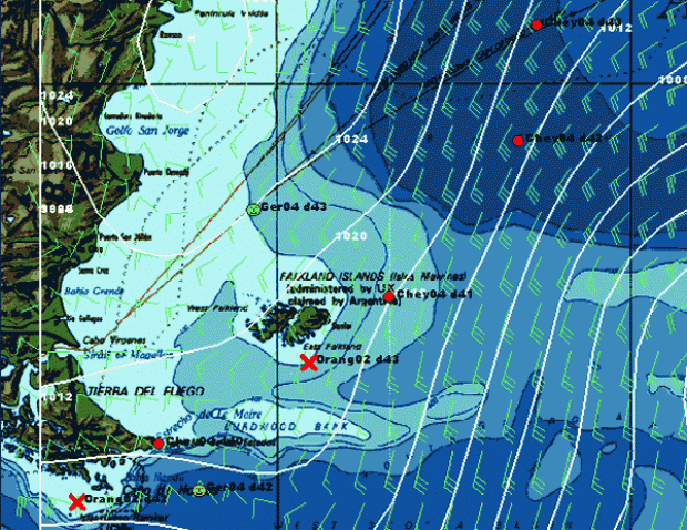 After rounding Cape Horn De Kersauson has hung a sharp left to get away from the Southern Ocean as quickly as possible, but looks to drive headlong into the arms of a high pressure system forming directly to their west. De Kersauson will want to get into favourable winds to the north of this but the forecast charts show the system moving northeast at a similar pace to them. Thus he will be faced with three options - sailing way out to the east to keep in the favourable winds to the east of the high, sail through the middle of the high (dangerous as the high is tracking in the same direction as they are sailing in and they could be trapped forever) or maintain their present course which will take them upwind to the west of the high. Alternatively de Kersauson's forecast could indicate the speed of movement of the system to be different to our forecast. We shall see over the course of this weekend.