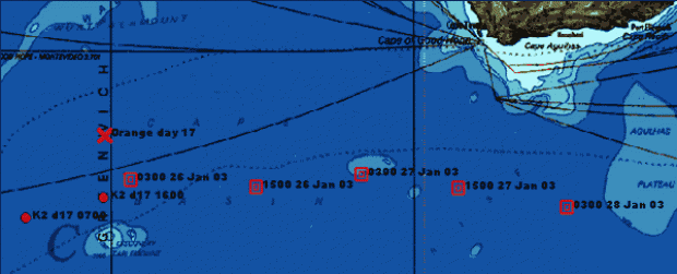 Red dot = Kingfisher2, red square = Geronimo, red X = Orange. Compare: K2 d17 0700, Orange d17 and 0300 28 Jan position for Geronimo
