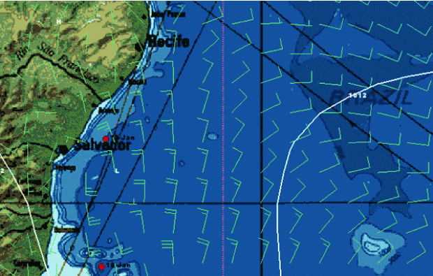 Assuming our wind charts are correct Joyon appears to be currently sailing upwind into around 25 knots on port tack. Ahead the wind situation is looking more complex with a small high pressure system situated overland to the west of Recife and the northwestmost branch of the St Helena high affecting the winds off the coast and with a small depression to the southeast of Salvador.