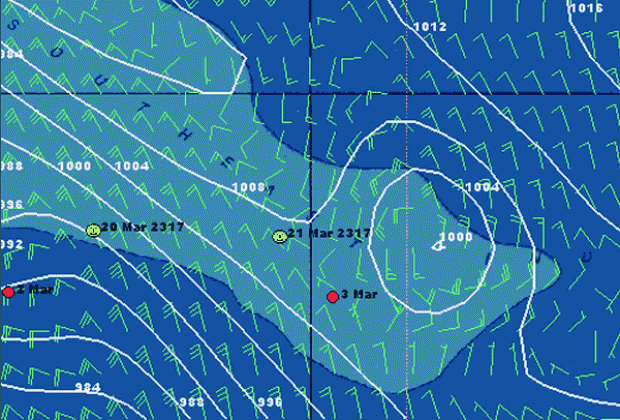At present Geronimo's progress is being held up by the ridge between the Southern Ocean depression to their southwest and a smaller secondary low that lies right in their path to the east. While this latter system is tracking south east, another secondary low to their northwest is just behind it and also moving south east. These secondary depressions look to merge over the next 24 hours leaving Geronimo wallowing in between. It looks like it won't be until tomorrow afternoon that Geronimo breaks back into the prevailing westerlies and can get back up to speed again.