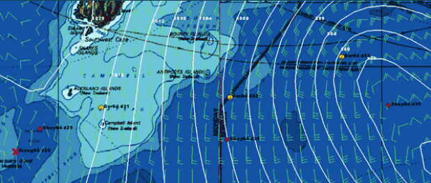 Geronimo are now positioned to the northwest of the depression that has been providing them with so much agro since the weekend. They are still experiencing southerly winds and seas. However the good news is that the depression is now behaving as a Southern Ocean depression should and has moderated slightly and is tracking ESE at roughly 110ft trimaran speed - so it looks like that Geronimo will be able to stay under the influence of the depression for the next few days.