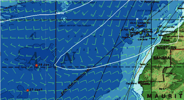 Over the course of today one of two scenarios is likely. If he is lucky Joyon will get away from the high pressure and will be able to hook into the slowly increasing southwesterly wind further north. If he is unlucky the undulating high pressure system centred to his northeast may simply engulf him again. Considering the light and variable conditions Joyon did extremely well to cover 230 miles yesterday.