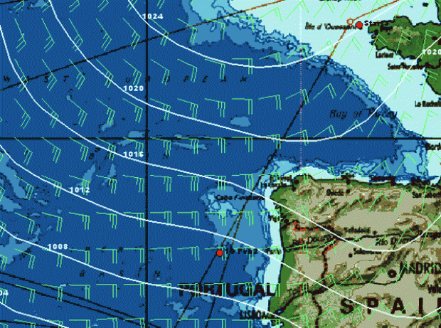 Ahead of them the weather is lining up nicely in the short team with a low pressure system to their south that is heading east. By tomorrow morning this will be centred to the east of Madeira providing Orange II with 30-35 knot following winds that will back round to the northwest the further south she sails. However beyond this the situation is looking less ideal with a wide band of high pressure effectively blocking their route south. This will make for relatively slow progress on Saturday.