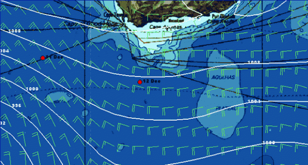 Currently Joyon is feeling the influence of a depression racing across the Southern Ocean at present to his southwest. Riding this weather system he has got at least two more days of his current rollercoaster ride. Ahead the weather situation is looking more complex with a large area of high pressure sitting over the Kerguelen Islands (ie directly on his route). This looks set to effectively stall the depression currently lying to Joyon's southeast forcing it south. But Joyon may be lucky and by the time he is approaching the Kerguelens the high pressure system may have moved out of the area.