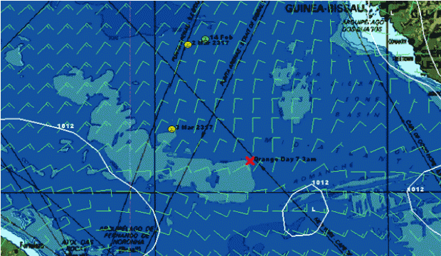 Yellow dots = Geronimo's positions, green dots = Cheyenne's equivalent position and red cross = Orange's record position. Weather for midnight last night