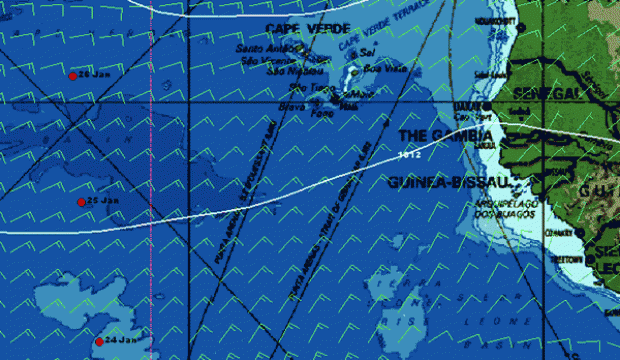 Joyon is presently sailing in the Trades but these are more easterly than northeasterly. Tomorrow he will see a big shift as the wind veers round to the south and come Tuesday night he will be completely truckin' with 15-20 knots from the southwest. How lucky is that? By Wednesday morning the wind appears to be due west before backing slightly to southwest and building to 20-25 knots.
