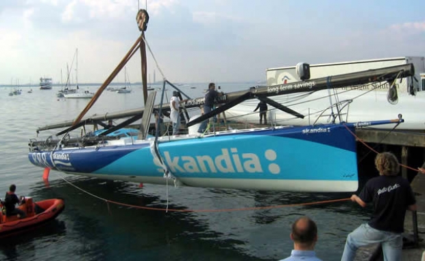Skandia left the boat shed in her new livery to be craned gently into the water. It has been a long four months of hard work for the team following a major refit that has included some big modifications to a boat that was custom-built for Nick's Offshore Challenges team-mate, Ellen MacArthur.