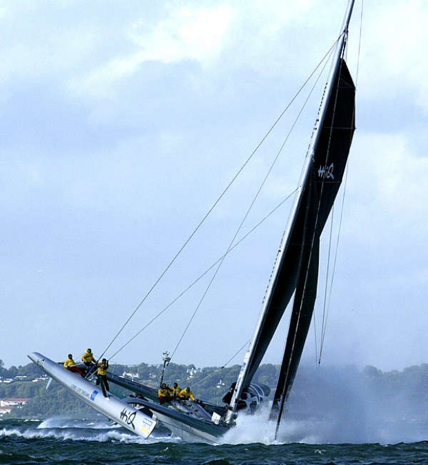 During the hoist the pole end was snapped and so the crew were forced to sail with the A6 spinnaker (masthead 724sqm) tacked onto the bow rather than flying on the pole...hardly ideal but still the giant monohull charged on sailing at 22-27 knots in 25 knots of wind, changing to a smaller A9 spinnaker for the final run to the line.