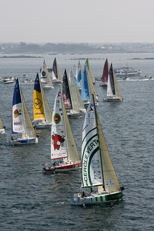 And so in brilliant sunshine the 25 Figaros started this afternoon in a 6-8 knot northeasterly on a course around the Bay of Concarneau for the benefit of spectators before they could set out across the Bay of Biscay. The start was watched by the crews of some 200 spectator craft. Eric Peron and Gwen Riou on Skipper Macif 2009 were fastest out of the blocks with Ronan Treussart and Yannick Clech on Lufthansa which were first to the buoy off the Figaro stronghold of Port-La-Forêt.