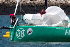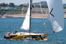 Throughout Thursday night, the four Class40 leaders and Hans Plas and Robin Verhoef's Open 40 Roaring Again had averaged around nine knots as they crossed the 60 miles of Lyme Bay towards Start Point before the finish line off Plymouth. However, on Friday morning, with under 30 miles to the finish, the boats stalled to sub-one knot averages in minimal breeze between Start Point and Prawle Point. At 09:00 BST, speeds picked-up marginally with SunGard Front Arena very close inshore, Fujifilm standing off seven miles south of Prawle Point and Solo and Phesheya-Racing taking the middle route with Bennett and Dickinson making double the speed of the inshore trio at a little under five knots.