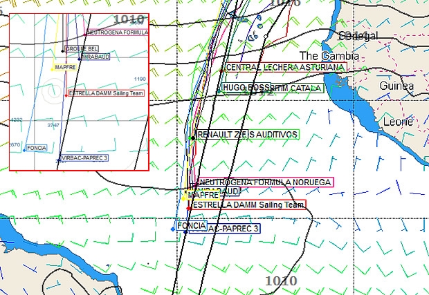 With the leaders slowing in the lighter winds, so the back marks have managed to close. Perhaps buoyed in the knowledge that Alex Thomson won't be swapping out Wouter Verbraak at some later stage of the race, so Hugo Boss has made one of the biggest gains, down from 678 off the lead 24 hours ago to 594 at the latest sched. Obviously the concertina will expand outwards again once the the leaders get fully into the southeasterly trades.