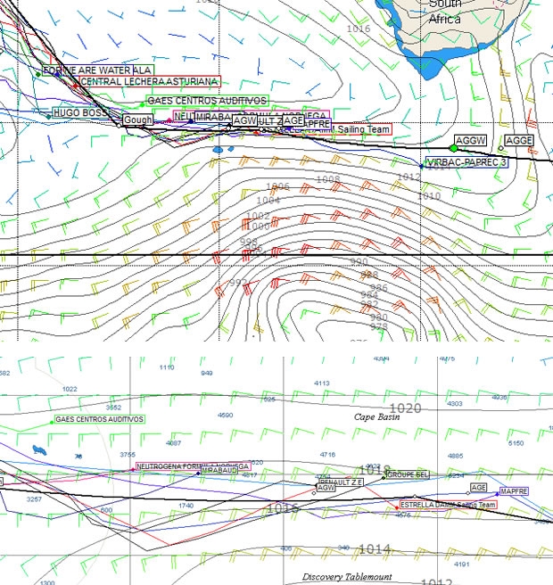 While the mid-fleet are basking in the big winds to the north of the depression, so the back of the fleet would appear from the GRIB files to be wallowing in the high once again , however there does seem to be pressure with all of them making more than 10 knots at the first sched this morning, with three just under 10 knots at the latest sched. The southerly lobe of the high is forecast to dip down across the Atlantic gate tomorrow before it leads the fleet into the Indian Ocean over the course of the weekend. Given its forecast track it appears that the same high that has dogged the majority of the fleet down the South Atlantic now wants to bid farewell to them before it disappears off to the east, between two Southern Ocean depressions.