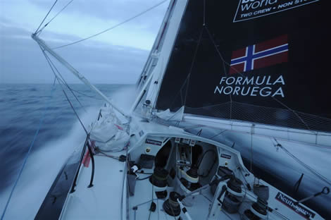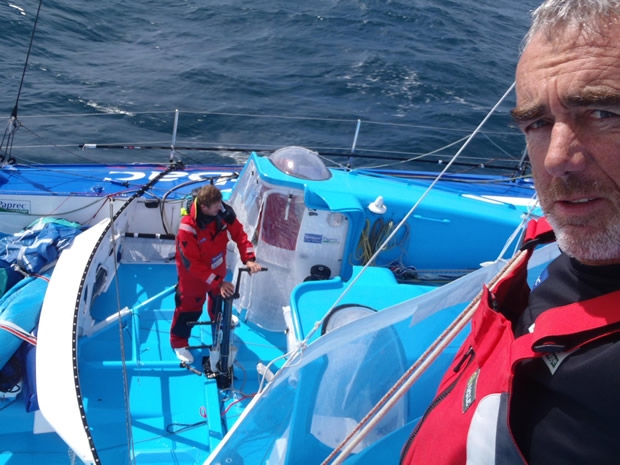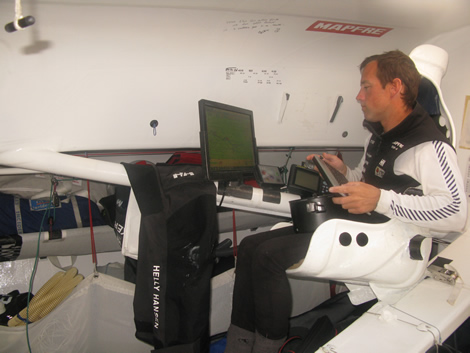 They will scarcely have concerned themselves with the fact that Virbac-Paprec 3 has conceded 150 miles since yesterday to second placed Mapfre, and is now just less than 600 miles ahead of the Spanish duo. Sailing on the wind in around 25 knots of southeasterly breeze, the duo are expecting a calm spell Monday before the cyclonic system hits them on Wednesday.