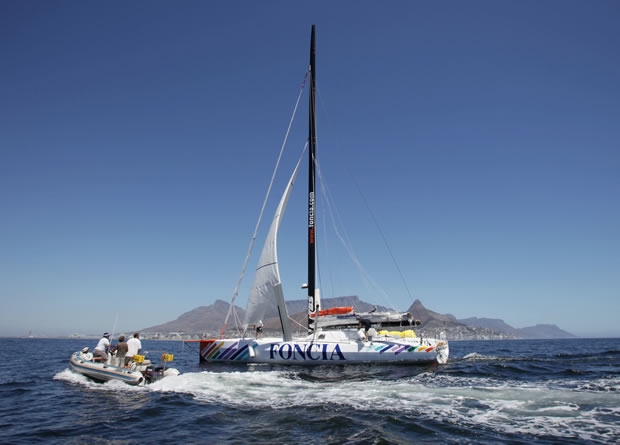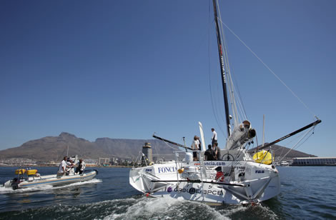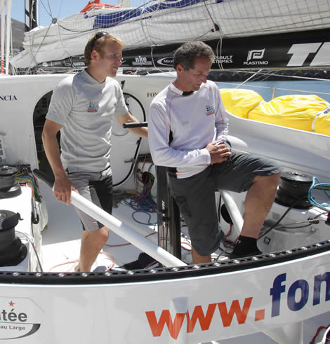 Greeted by the Foncia Team’s shore crew and Yves Gévin, Chairman of the Board of the Foncia Group, Michel Desjoyeaux and François Gabart arrived in Cape Town early afternoon today.