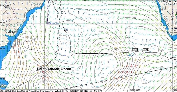 The weather situation has developed over the last 24 hours. The high remains to her southeast and it is reaching the favourable northeasterlies in the top left quadrant of this that is causing Banque Populaire to pick up speed this morning. There is more pressure here than was being forecast yesterday with a depression currently popping out of the mouth of the River Plate (between Argentina and Uruguay), to her southwest, encouraging the northerly flow.