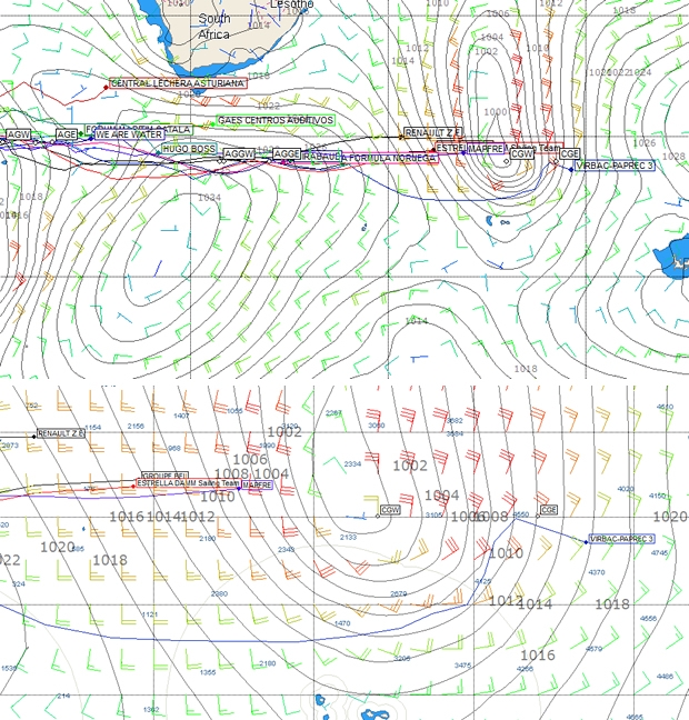 As the chart above shows, a significant depression is currently separating Virbac Paprec 3 from the boats immediately astern of her. This depression is rapidly heading south over the course of today, dragging a front behind it. So the leaders are set for a very fast, possibly record breaking couple of days, as they sprint away in strong northerlies, hopefully keeping their nose ahead of the front. But those behind, led by Iker Martinez and Xabi Fernandez on Mapfre, are also set for a speedy 48 hours but in completely reverse conditions - in strong southerlies in the northwest quadrant of the depression.
