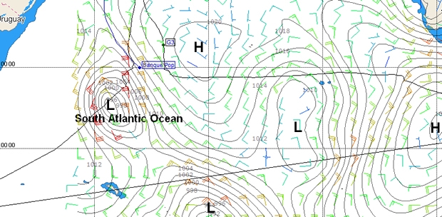However. This being the unpredictable South Atlantic, all is not quite as simple as it might be. While Banque Populaire could very easily turn in an 800 mile day over the next 24 hours in these conditions, unfortunately the depression isn't moving fast enough east for her to achieve this. Also if she wants to stay in the optimum breeze, this will take her a long way south, towards the mid-40°Ss and this increases the risk of encountering ice (bear in mind that to minimise this risk the Barcelona World Race organisers have kept their boats north of 40°S). The alternative is turning east which will take her back into the high and more light winds.