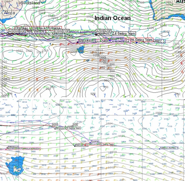 As mentioned the Hugo Boss crew has the GAES girls firmly in their sights. The two boats have taken different options with GAES to the north, already having complied with the requirements of the Crozet Gate while Hugo Boss is some 120 miles to their south, eating up the miles in strong northwesterlies, but have still to make it north to make the eastern end of the gate. They look to be in better shape weather-wise as should not get caught in the hgh like Mirabaud and Neutrogena.