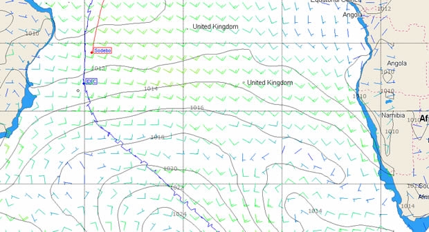 At present the main lump of South Atlantic high pressure is centred around 40°S with a depression forming in the mouth of the River Plate. By Wednesday the high has shifted south of South Africa although it has a long tail/ridge still extending into the central South Atlantic. Come Thursday another area of high pressure is developing off the coast of Argentina, separating a major depression in the Southern Ocean and the one off Uruguay. Essentially this forecast is an average one - it does potentially allow her to 'cut the corner' but come Wednesday Sodebo is going to have to negotiate an area of high pressure before she can hook into the favourable northeasterlies to the northeast of the depression.