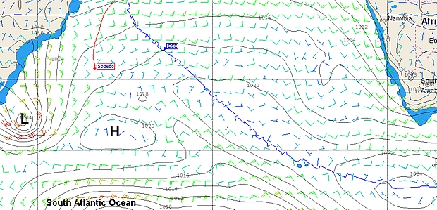 The Sodebo routing team are expecting the depression to head east causing the breeze to fill in over the next 24 hours. The GRIBs show the centre of the depression remaining where it is but its reach extending east, so that the northerlies or northeasterlies should fill in more firmly for Sodebo over the next 24 hours. But as we mentioned yesterday more crucial is what the high to the south/east is doing. Unfortunately Sodebo is about a day early on the scene for the high blocking her route to the Southern Ocean is due to head northeast leaving favourable northerlies in her wake, on Saturday. However Sodebo will be knocking on the door of the high on Friday... So Friday will be light and one imagines that Coville will have no option other than to soldier through it. All will be good after this though as she is then straight into powerful westerlies. However on his present course, Sodebo will still be passing into the Southern Ocean (40°S) some 1,250 miles west of Francis Joyon's track on IDEC. IDEC reaches 40°S on the equivalent of Friday night in Sodebo time.