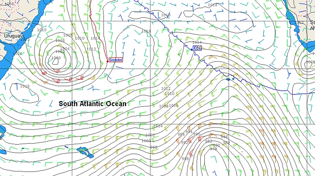 In the Southern Ocean meteorologicial roulette game, conditions are finally coming good for Thomas Coville and his maxi-trimaran as they approach the Roaring 40s. The depression that has been centred in the mouth of the River Plate throughout this week, finally seems to be breaking away from the land and is slowly moving east with the effect that the high that has been encircling it to the south and east is being divided in two. As a result the northerlies on the east side of the depression have filled in again with the result that since 0100 this morning Sodebo has been averaging 22-23 knots. With the depression dividing in two, the eastern part moving north towards the middle of the South Atlantic, so this should allow Coville to make a seamless transition into the strong westerlies, more characteristic of the Southern Ocean.