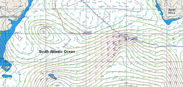 Over the next 48 hours another intensifying depression is moving east along 55°S and tomorrow afternoon Sodebo will be able to pick up the strong northwesterlies preceeding the front associated with this. These conditions in this stretch of water to the west of South Africa are often record breaking - remember ABN AMRO Two in the Volvo Ocean Race before last or Virbac Paprec 3's 516 mile run here in the Barcelona World Race. So watch those 24 hour run figures over this period (Coville is the current holder of this record - 628.5 miles set on his transatlantic record attempt in 2008). Here, finally, is an opportunity for Coville regain the miles lost in the South Atlantic on IDEC.