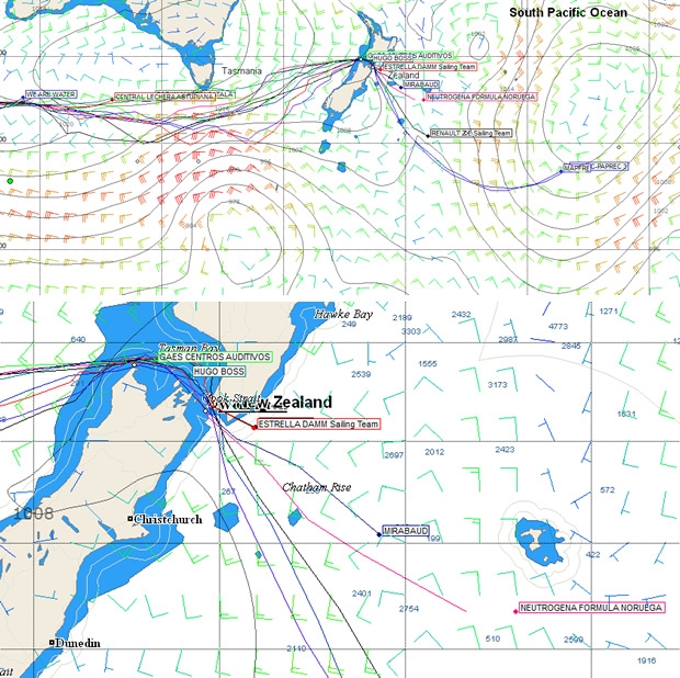 Through not stopping in Wellington, Pachi Rivero and Antonio Piris aboard Renault ZE Sailing Team (the former Virbac Paprec 2, winner of the last Barcelona World Race) are now up to third place, but all the boats immediately to the east of New Zealand are suffering from an area of high pressure currently located over New Zealand's south island.