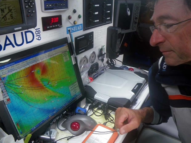The four duos who are dealing with the difficult low pressure system, which was formerly cyclone Atu, have been bending to their task since this morning. After discussing strategies several times Estrella Damm and Groupe Bel have taken slightly different approaches, with Estrella Damm looking to be well placed up to the north of the centre of the system late this afternoon, giving them good options to emerge on its northeast side, while Groupe Bel were more to the south and east but almost equally well positioned in terms of having options to get east. Wind speeds may have been downgraded but the chaotic, huge seas created by the passage of the strong winds from changing directions over a relatively small area and a short space of time, were likely to be the biggest problem.