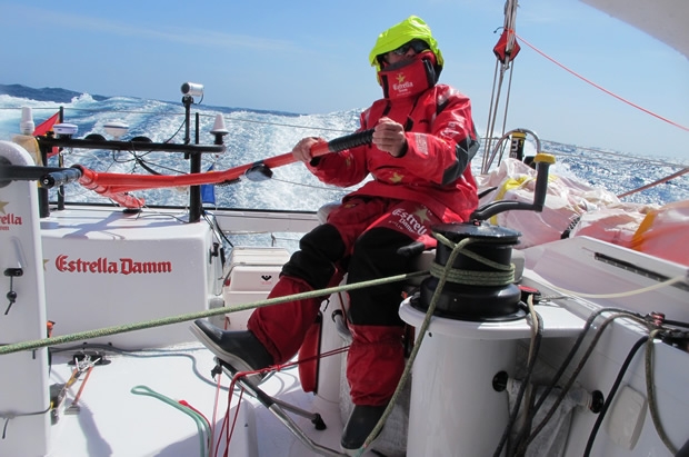 Jaume Mumbrú and Cali Sanmarti reported that they are both fine, but unable to gybe due to a broken lazyjack and other sundry problems the duo were making slow southeasterly course during the early afternoon, before heaving while they baled water out of the boat and try to sort out their electronics problems. The impact of the wave ripped apart plastic spray curtains which protect part of the cockpit. Part of the electrical equipment is not working at the moment.