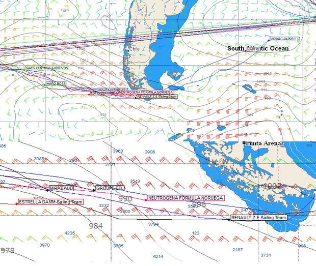 All five boats now on the approach to Cape Horn are sailing in fruity 30+ knot conditions, hence why it is they that are clocking up the highest speeds in the fleet at the moment, Renault having averaged 18 knots between the last two scheds. Conditions are due to abate over the next 24 hours. All look set to pass close to Cape Horn. The question then will be - do they tough it out on the more direct course to the west of the high or do they follow Virbac Paprec 3 and Mapfre by going the pretty way to the east?
