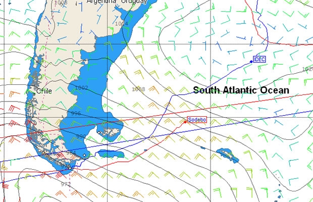 However at present Sodebo's course seems to be taking her directly into the centre of where the forecast indicates the high will be, even though the forecast has it shifting marginally to the southeast come Saturday. The good news for Coville is that although the high is in his way come Saturday there appears to be stronger winds generally around its perimeter and this will provide him with more options.