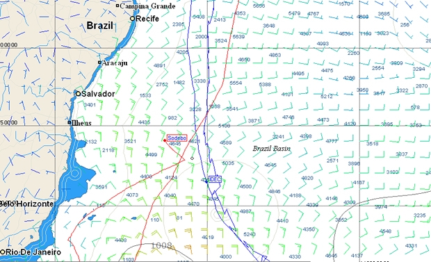 With Sodebo having to put in a tack to the northeast over the course of yesterday to order to get some searoom from the Brazilian coast, so Coville has been fortunate that so far he has managed to maintain his hard earned lead over the comparible pace of Francis Joyon and IDEC. At 0100 this morning Coville tacked back on to starboard, but while the northerly wind meant that yesterday's port tack offshore wasn't as painful as it might have been, compared to Sodebo, IDEC was much more lifted at this point of her voyage and was able to lay a course allowing her to pass Recife. Since she tacked Sodebo has been on a course for Salvador and Coville is likely to have to put in at least two further tacks until he is adequately east enough and in easterly breeze in order to get past the easterly bulge in Brazil. This lies some 270 miles to due north of her present position. The upshot is that in 24 hour time Coville is likely to be back to being neck and neck with his virtual rival.