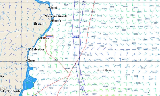 He's behind again. As we suspected yesterday Thomas Coville and Sodebo's difficult 24 hours on the wind have put him back behind Francis Joyon and IDEC as they fight to get around Recife. Rather than tack back out to sea yesterday, Coville has in fact ploughed on towards the Brazilian coastline and the chart above makes it very evident why - inshore there is more breeze and Sodebo has been able to pick up a significant lift.