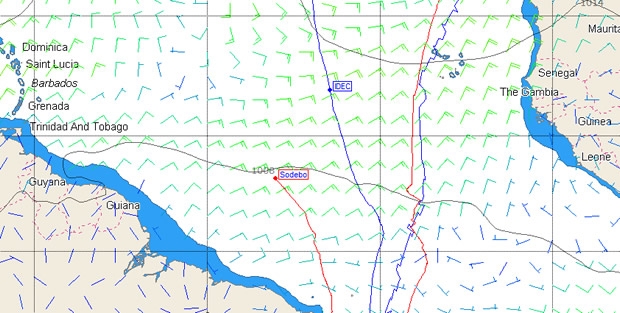 Back in the North Atlantic and into the northeasterly trades, this morning Sodebo fully has her afterburners on, her four hourly average up to 22-23 knots. However her course is not good. Having shaved past Recife, Sodebo crossed the Equator at 35°24W some 315 miles west of where IDEC crossed. Since then for reasons that aren't clear, she has been heading on a decidedly northwest course (rather than northerly or northeasterly). As result her deficit on IDEC has been steadily increasing - up to 523 miles at the latest update.