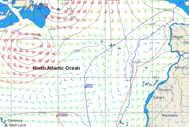 Since crossing the equator last Sunday, Coville has been focusing on speed rather than heading. Generally Sodebo's speed has been good as she reaches across the Trades. The first task is to get around the giant ridge that is pretty much spanning the Atlantic from the Canaries to the northern Caribbean. Sodebo will spend the next 24-36 hours passing through this before the wind veers southeast at around 25°N and then, finally, Sodebo will be able to swing her bows starboard more or less towards the mark. This will coincide with a depression (not the one currently located off the eastern seaboard of the USA, but the one queued up astern of it) emerging into the Atlantic providing the building southwesterlies to get Coville home.