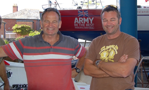 Since announcing their entry in the doublehanded, Class40 Global Ocean Race 2011-12 during the first week in April, Ross Field and his son, Campbell, have been awaiting the arrival of their Verdier Design Tyker Class40 ex-Desafio Cabo de Hornos. On Tuesday, shortly before noon, following a five-week journey as deck cargo from Chile via the Panama Canal and Rotterdam, the New Zealand team’s Class40 was carefully manoeuvred on a 60ft truck through the narrow lanes of Lymington in Hampshire on Britain’s South Coast.