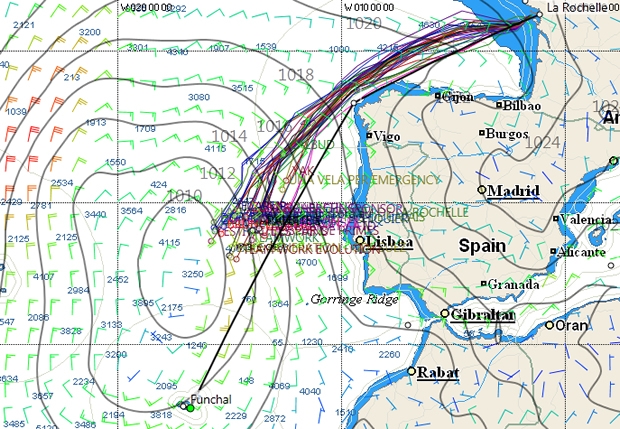 Weather-wise the forecast indicates the situation has changed from what was being shown yesterday with a lobe of the high pressure over the Iberian Peninsula now extending southwest tonight. The trend on Monday is that there will be pressure, albeit from the south on the west side of the race course and substantially less pressure and more from the east on the east side of the course. However the good news is the latest forecast indicates on Monday afternoon the high shrinking back towards Spain and the low out in the central Atlantic shifting further south than previously being shown, leaving behind it more favourable southeasterlies across the race course, the wind continually backing into the northeast towards the middle of the week - ie it will be a fast finish.