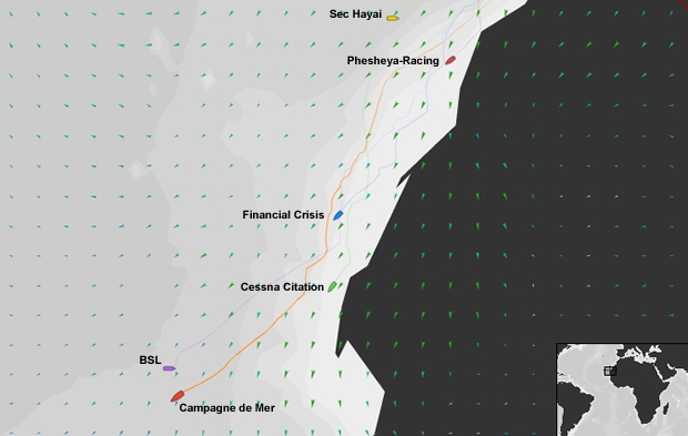 Throughout Tuesday, the northeasterly breeze became increasingly stable, benefiting Campagne de France and BSL first, with Cessna Citation picking up the pace at noon, followed by Financial Crisis a couple of hours later. By 15:00 GMT, Phesheya-Racing and Sec. Hayai – 430 miles north of the leading boat – were also into fresh breeze and for the first time in five days since the six Class40s left the Mediterranean and began the complex voyage along the African coast, the entire fleet was averaging over eight knots of boat speed.